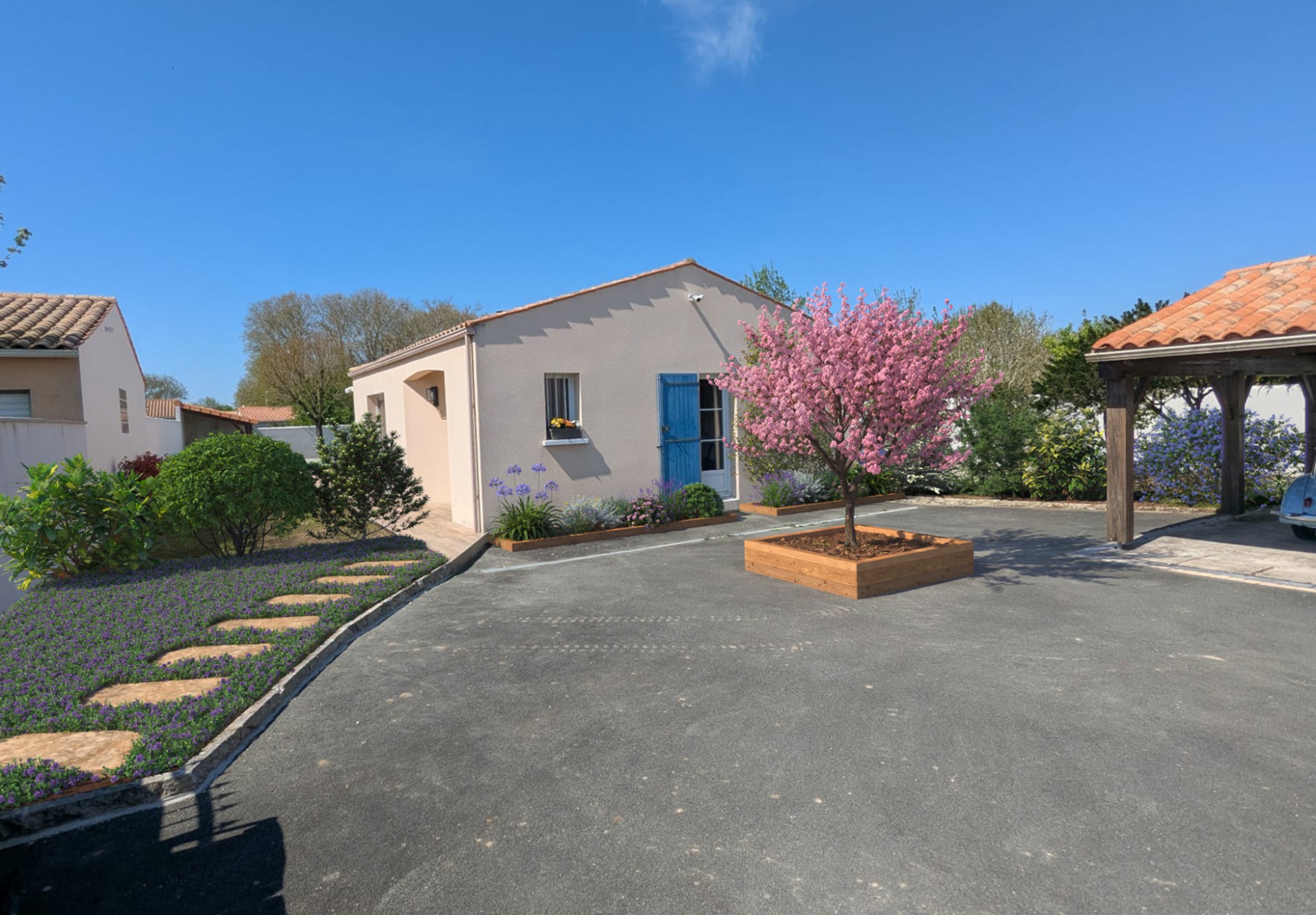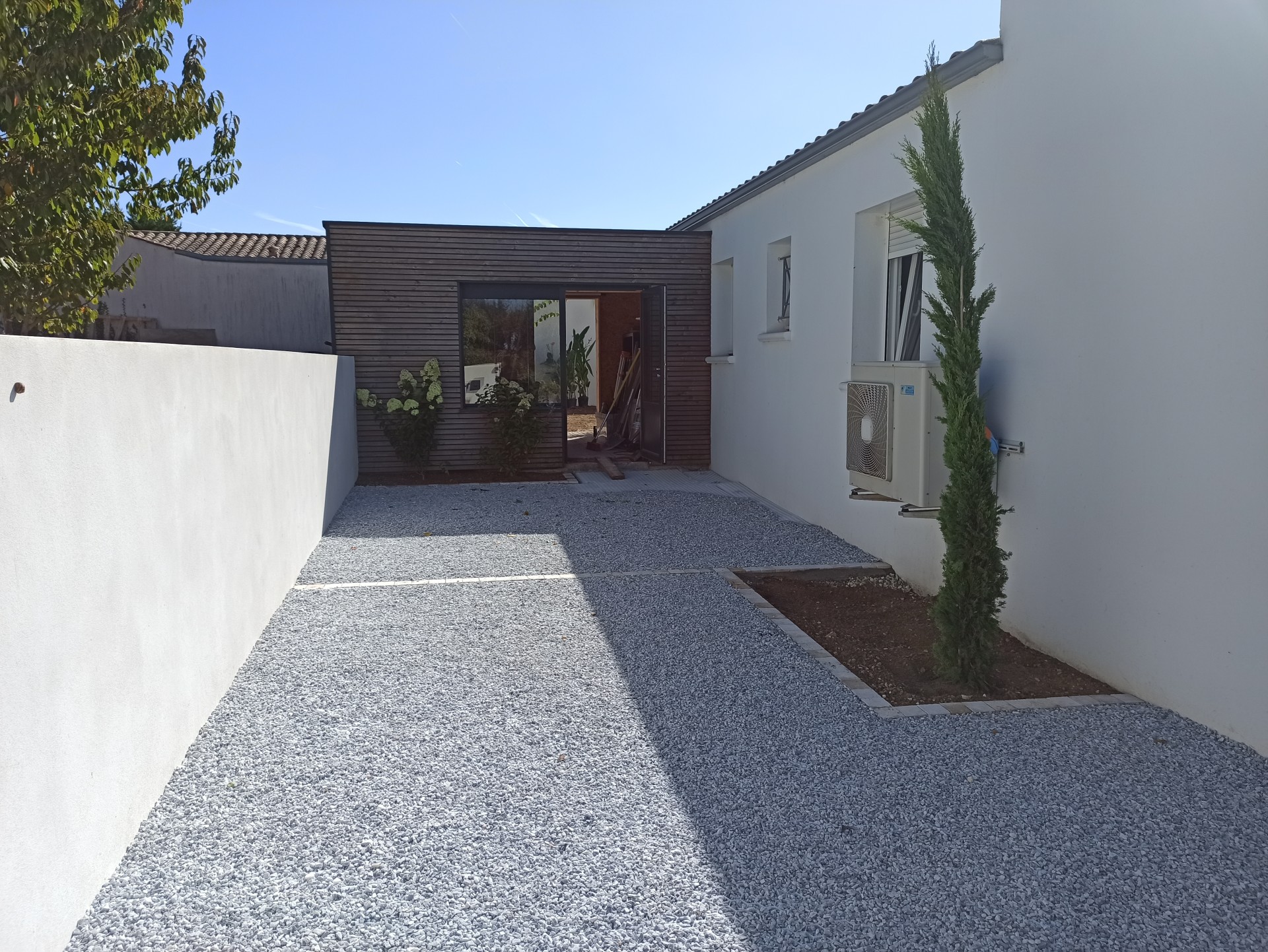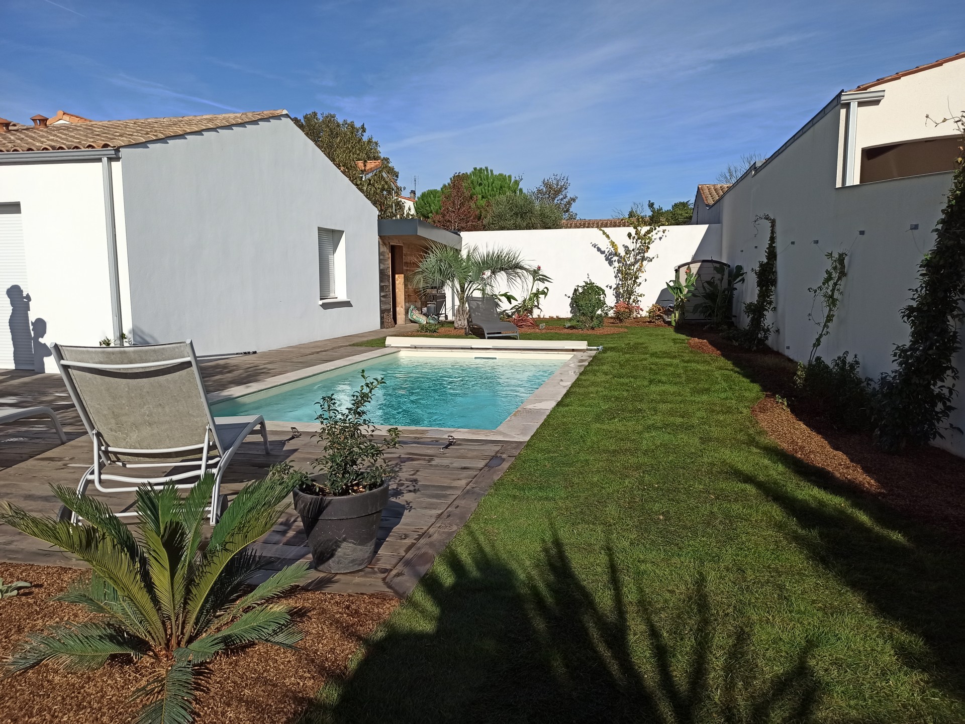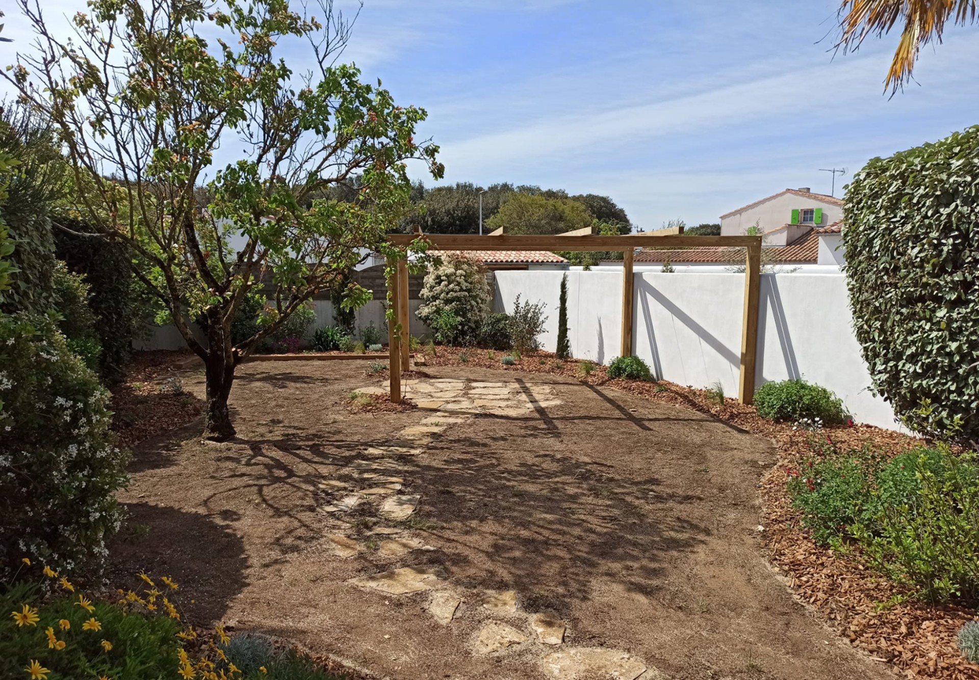 Aux portes de La Rochelle et à proximité de l’océan, conception et réalisation d’un jardin de détente et d’agrément. Terrasse en bois, plantations et gazon de plaquage. A l’avant, requalification de la zone de stationnement en graviers stabilisés