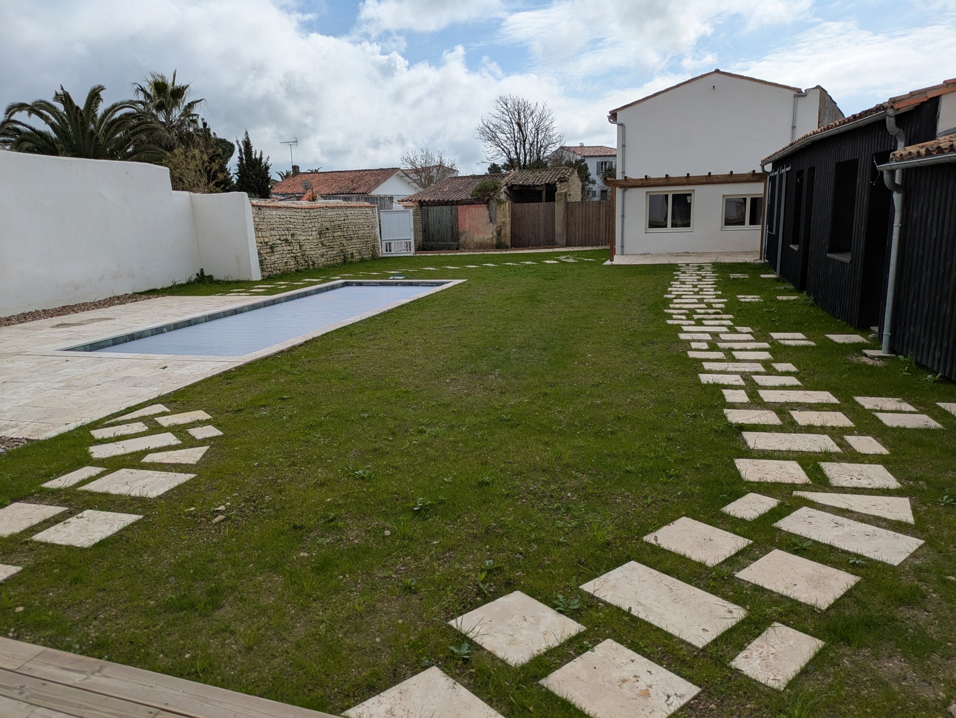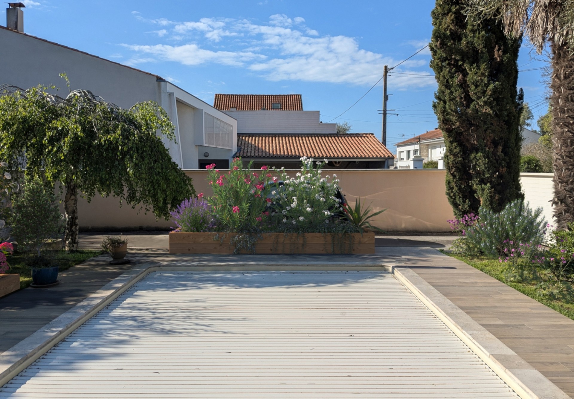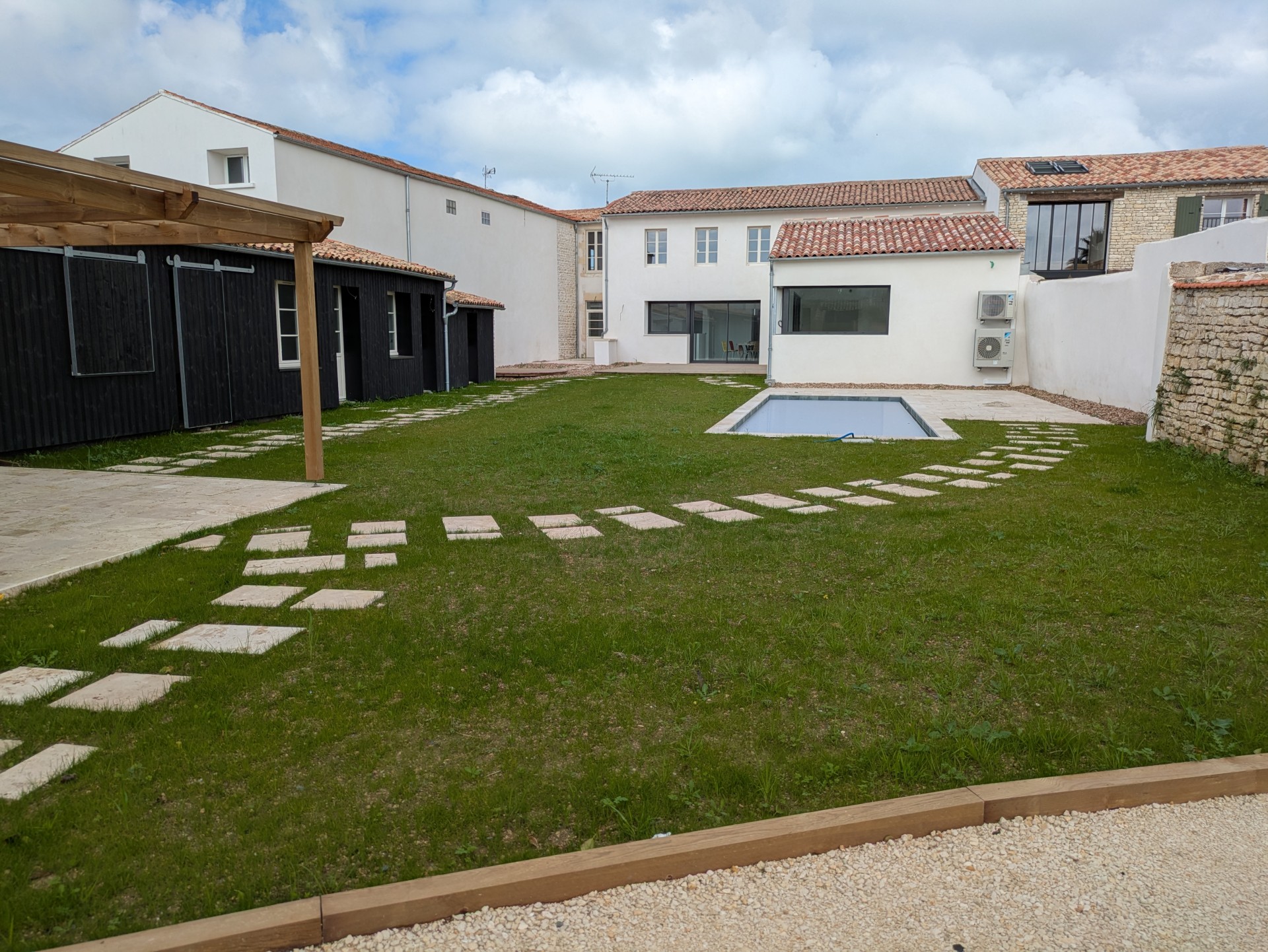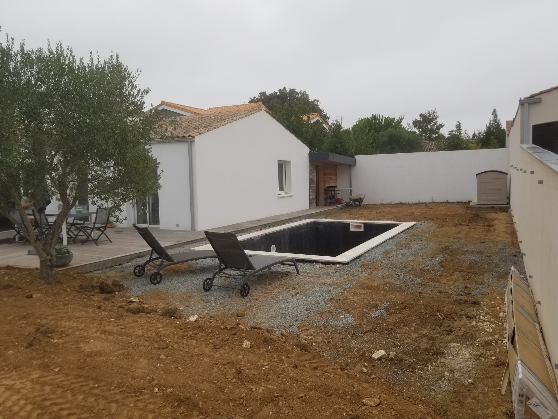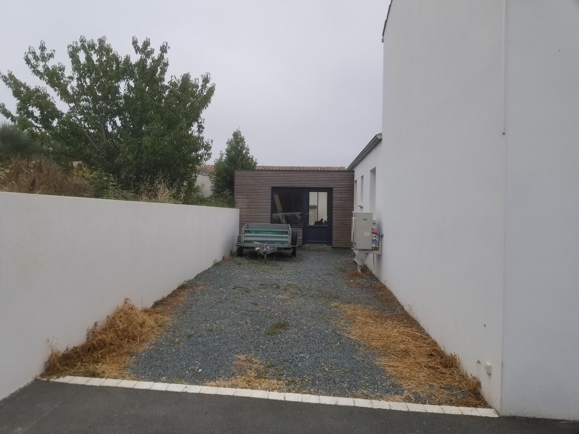 Aux portes de La Rochelle et à proximité de l’océan, conception et réalisation d’un jardin de détente et d’agrément. Terrasse en bois, plantations et gazon de plaquage. A l’avant, requalification de la zone de stationnement en graviers stabilisés