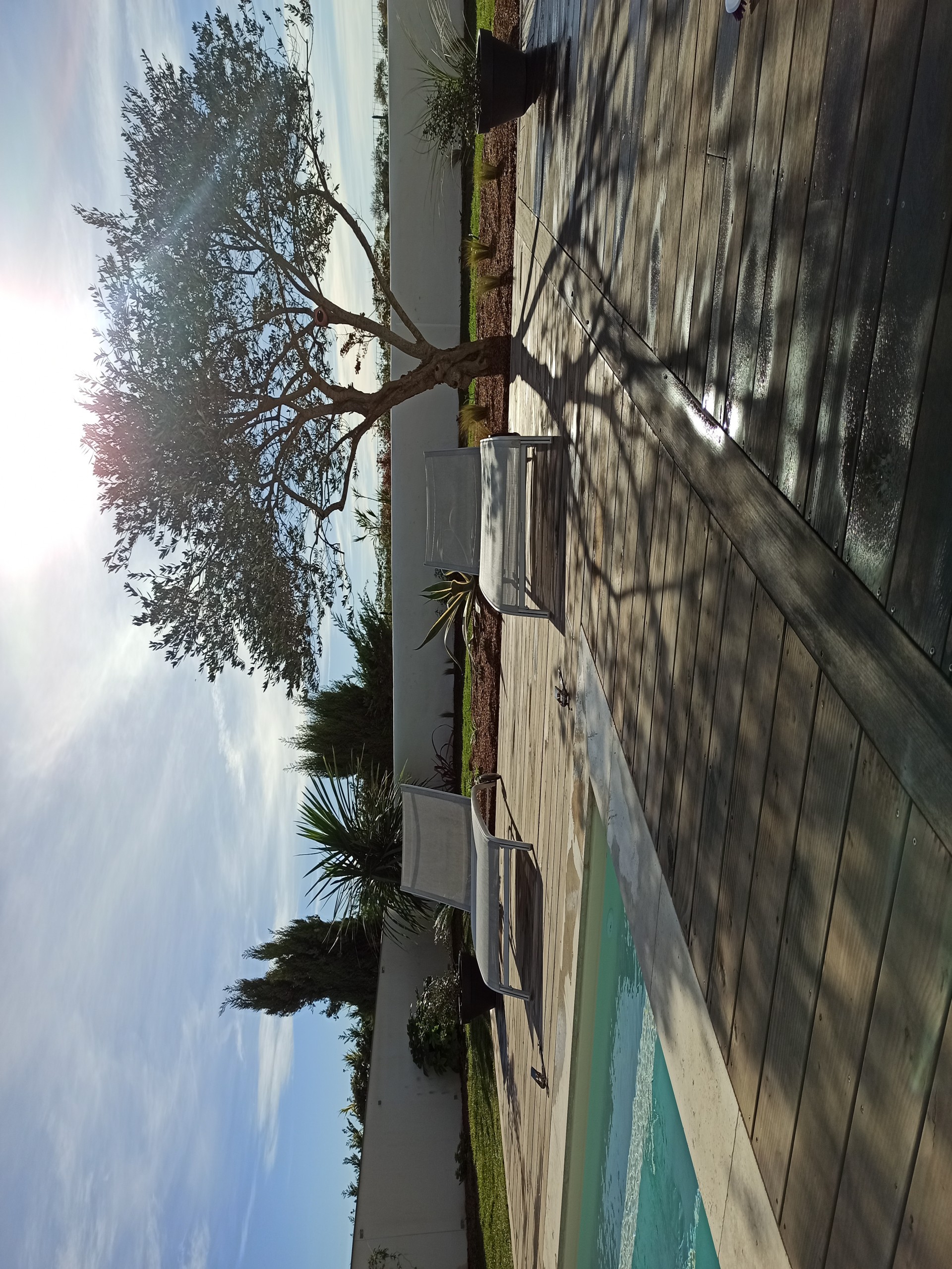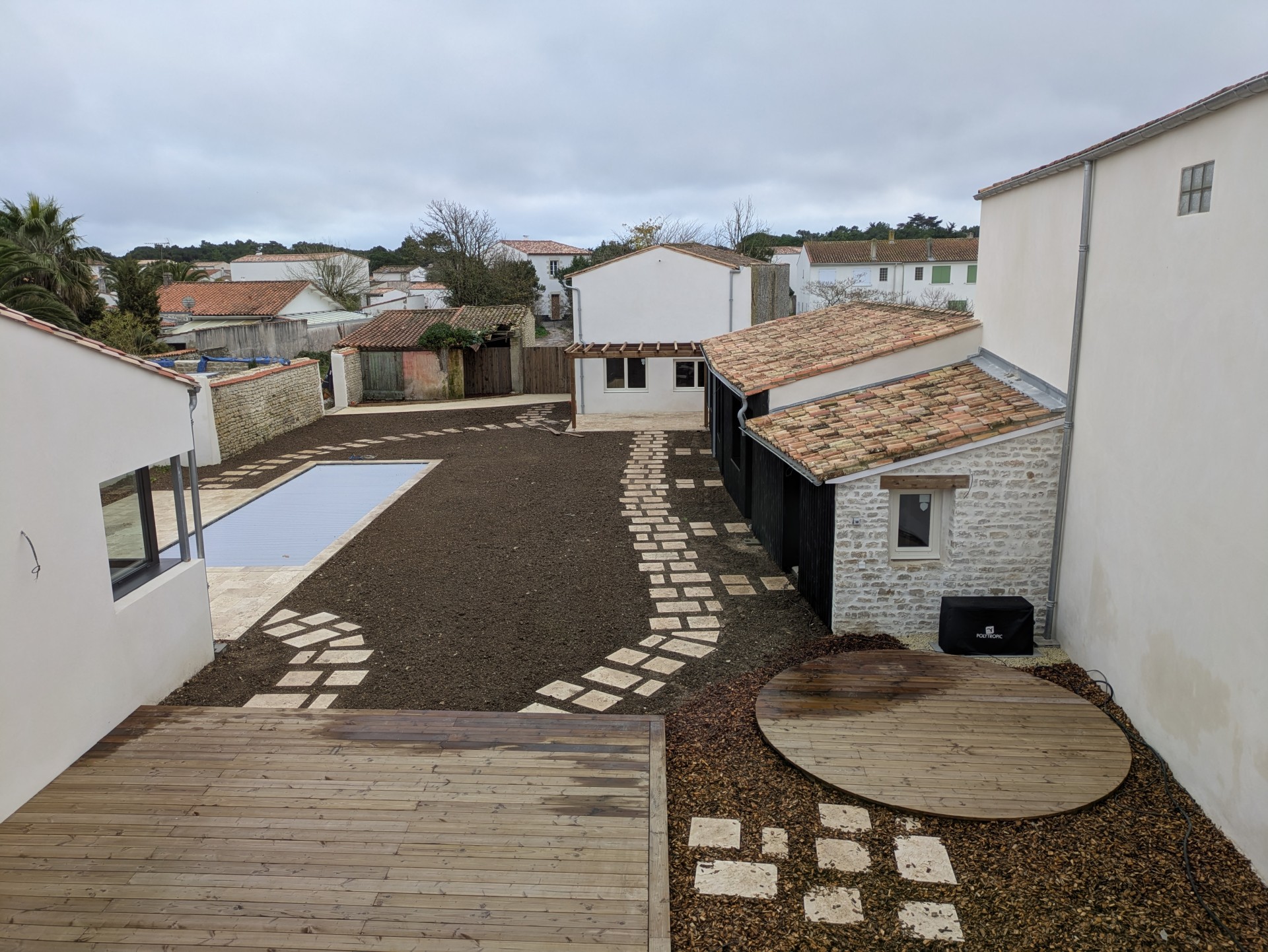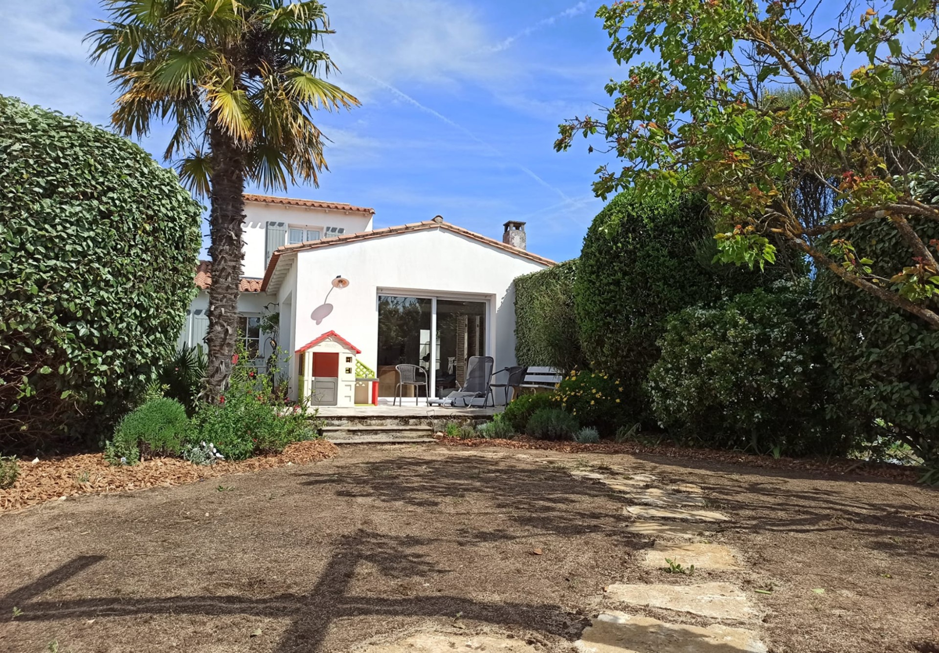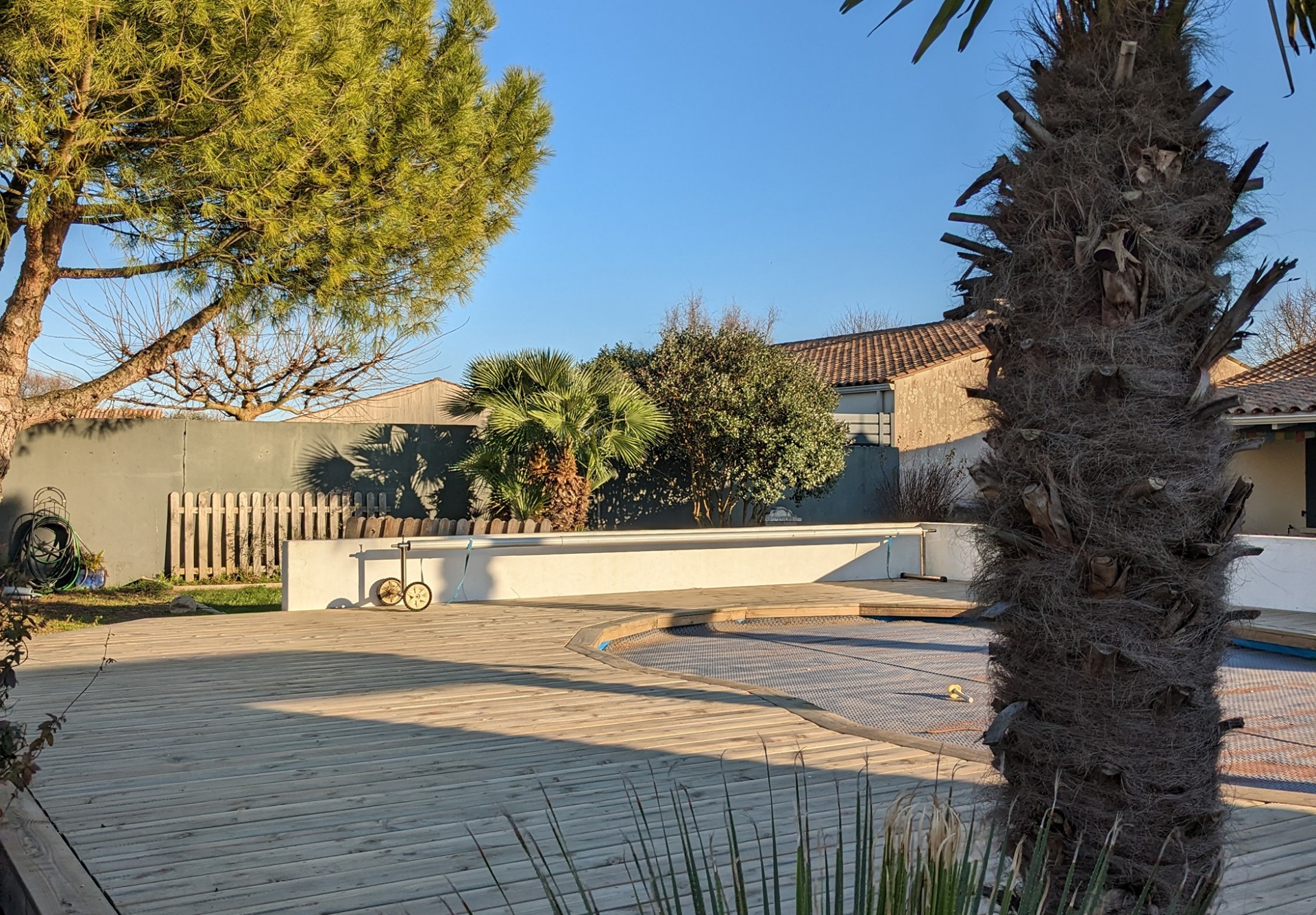 Aux portes de La Rochelle et à proximité de l’océan, conception et réalisation d’un jardin de détente et d’agrément. Terrasse en bois, plantations et gazon de plaquage. A l’avant, requalification de la zone de stationnement en graviers stabilisés