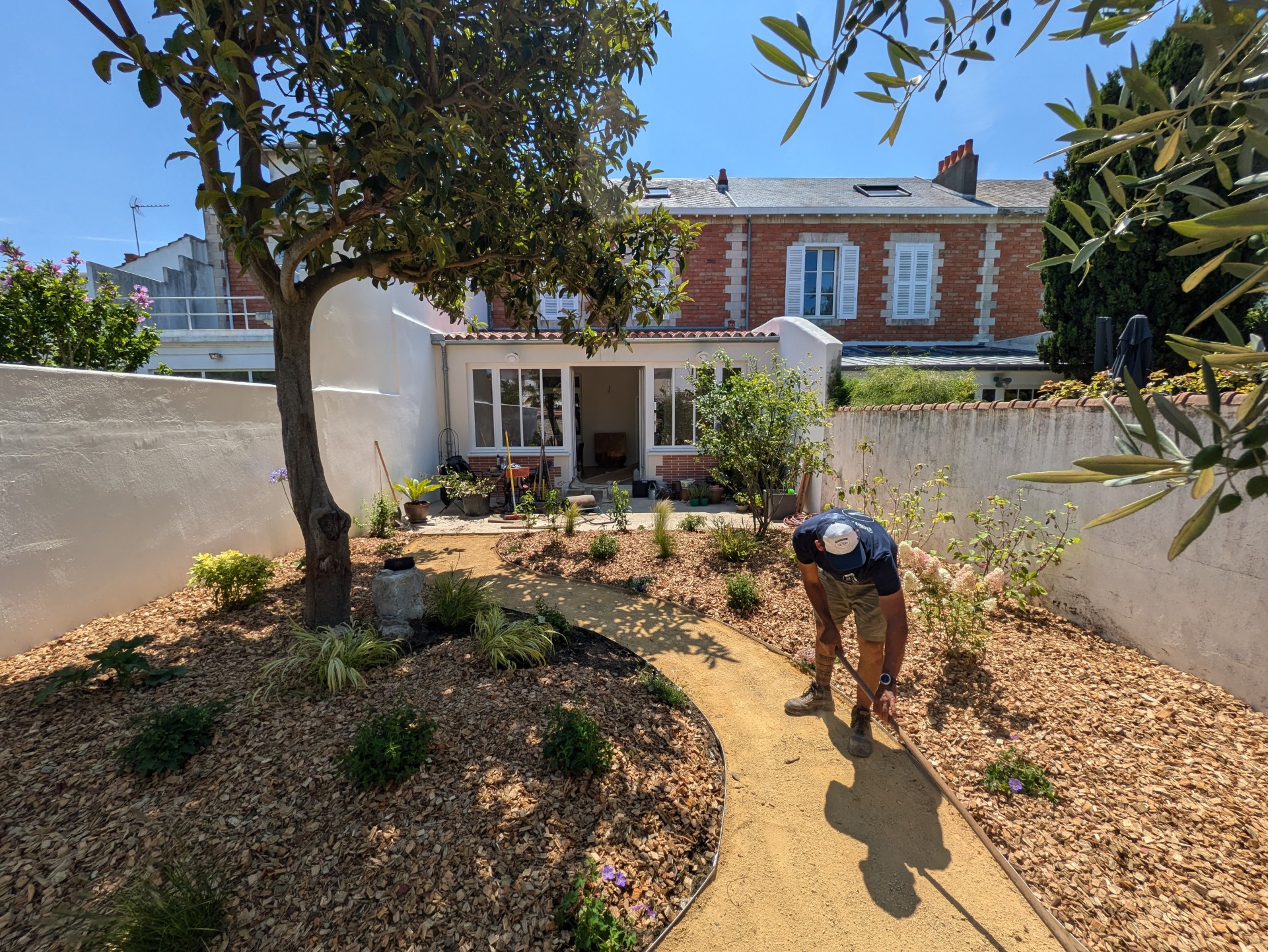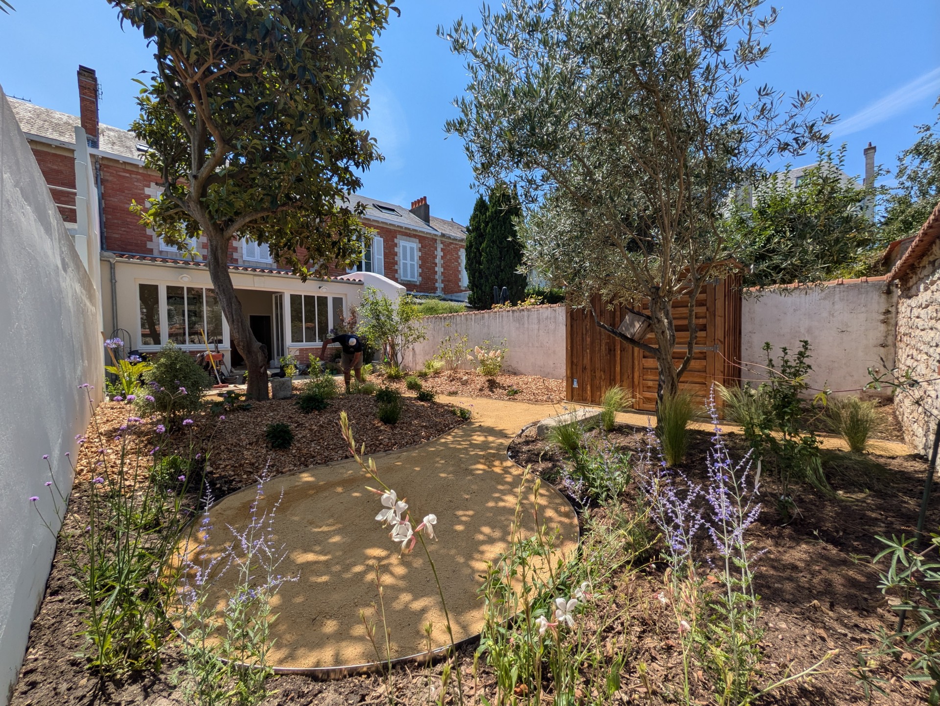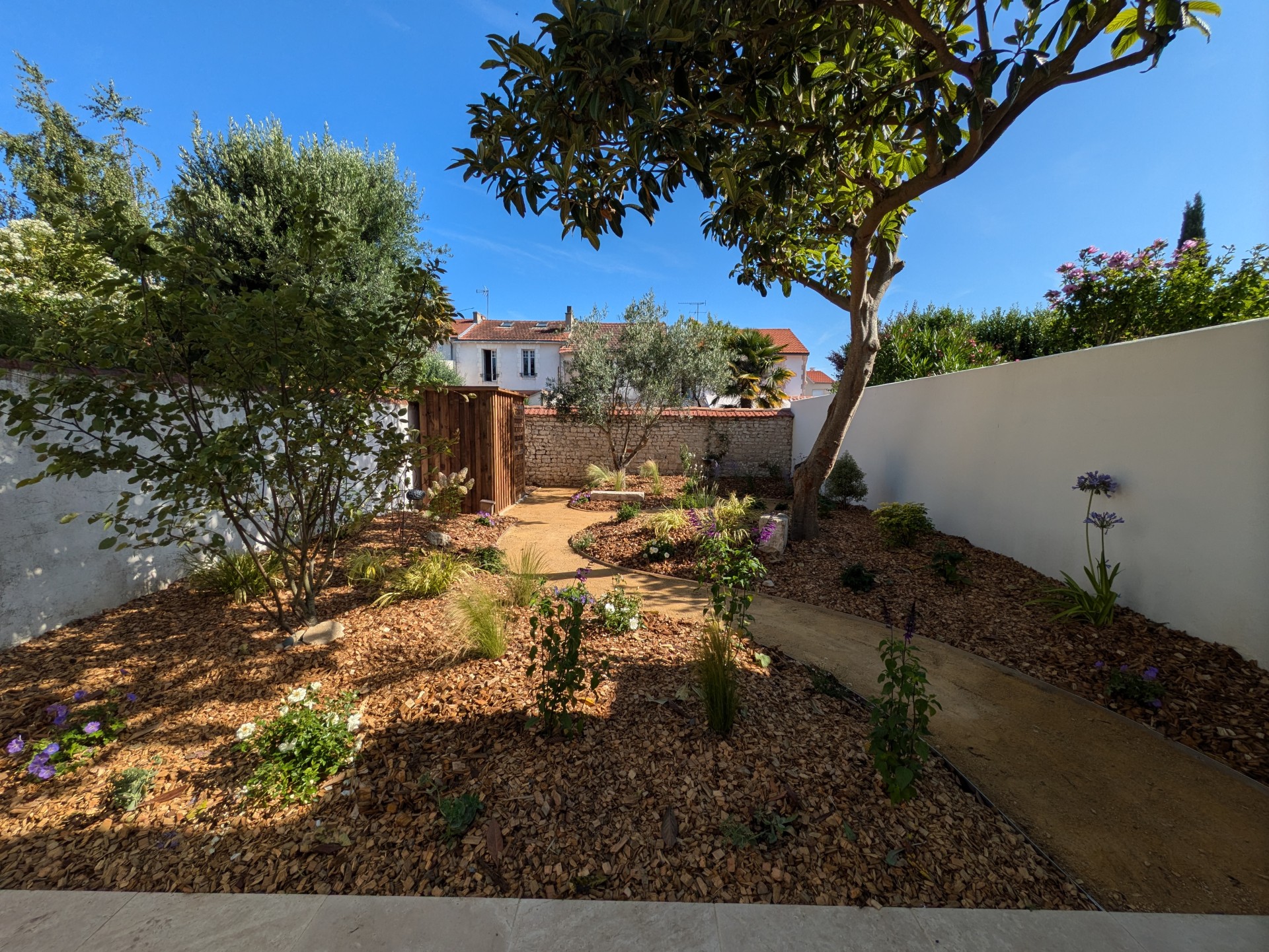 Au cœur de la rochelle, ce jardin a été imaginé comme une oasis apportant fraicheur et floraisons toute l’année. Installation d’un cabanon de jardin, réalisation d’un cheminement en calcaire, bordures en aluminium, plantes méditerranéennes et copeaux de bois au sol