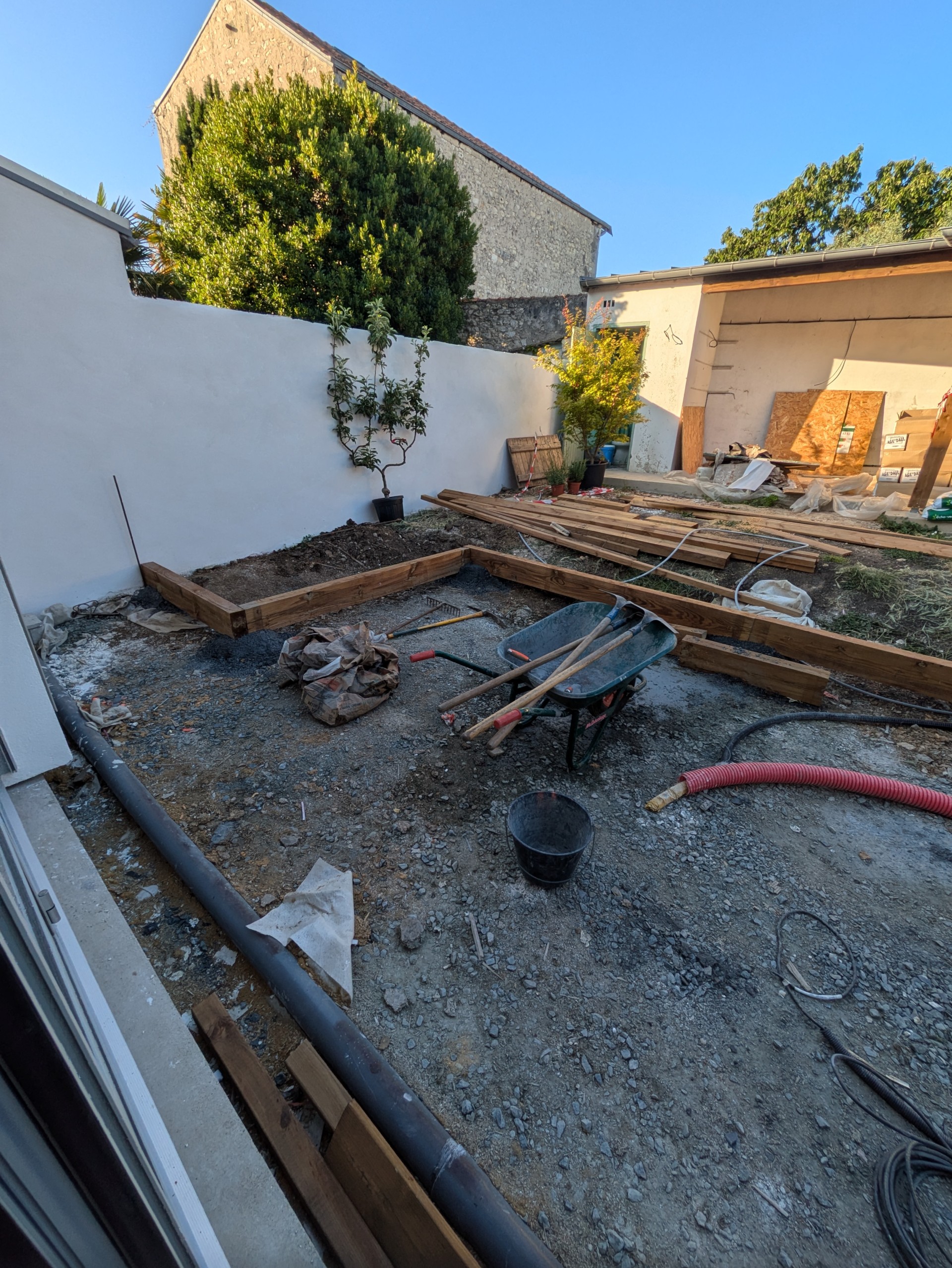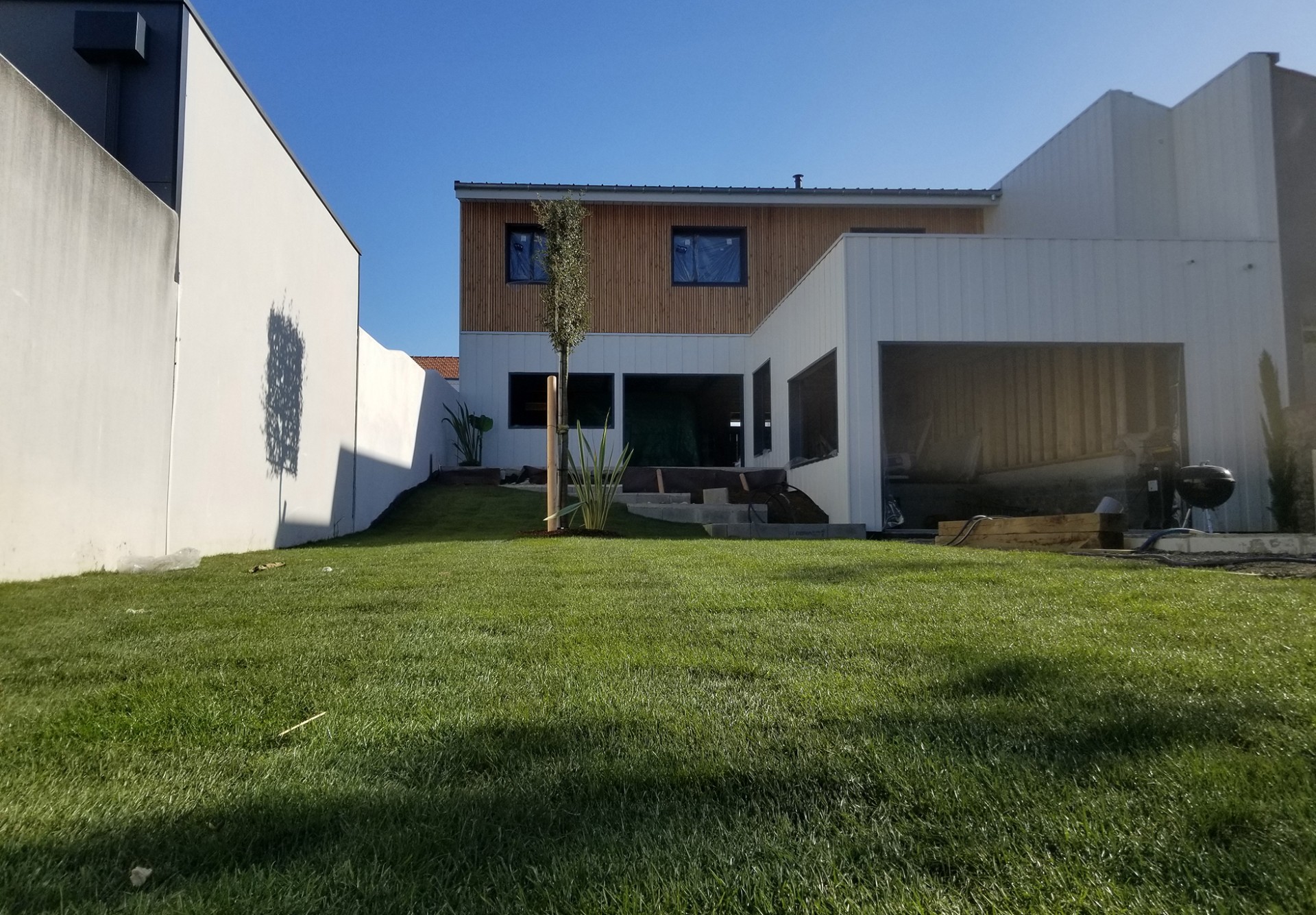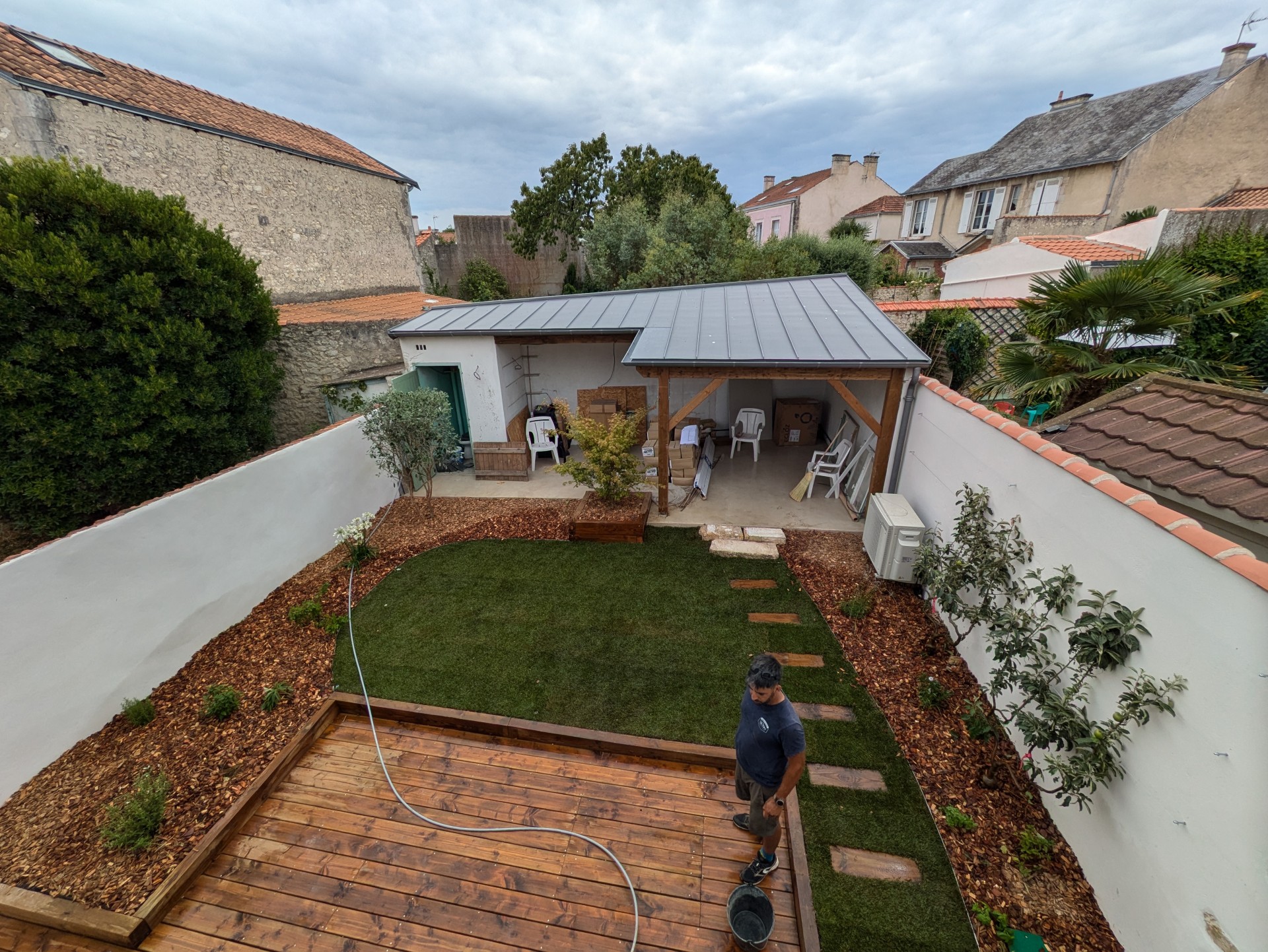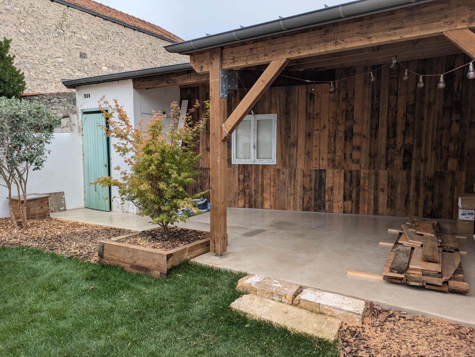Ce petit jardin nécessitais le plus grand soin. Soutènement en traverses paysagère, terrasse en bois et gazon de placage avec système d’arrosage automatique etbardage bois sous l’appentis.