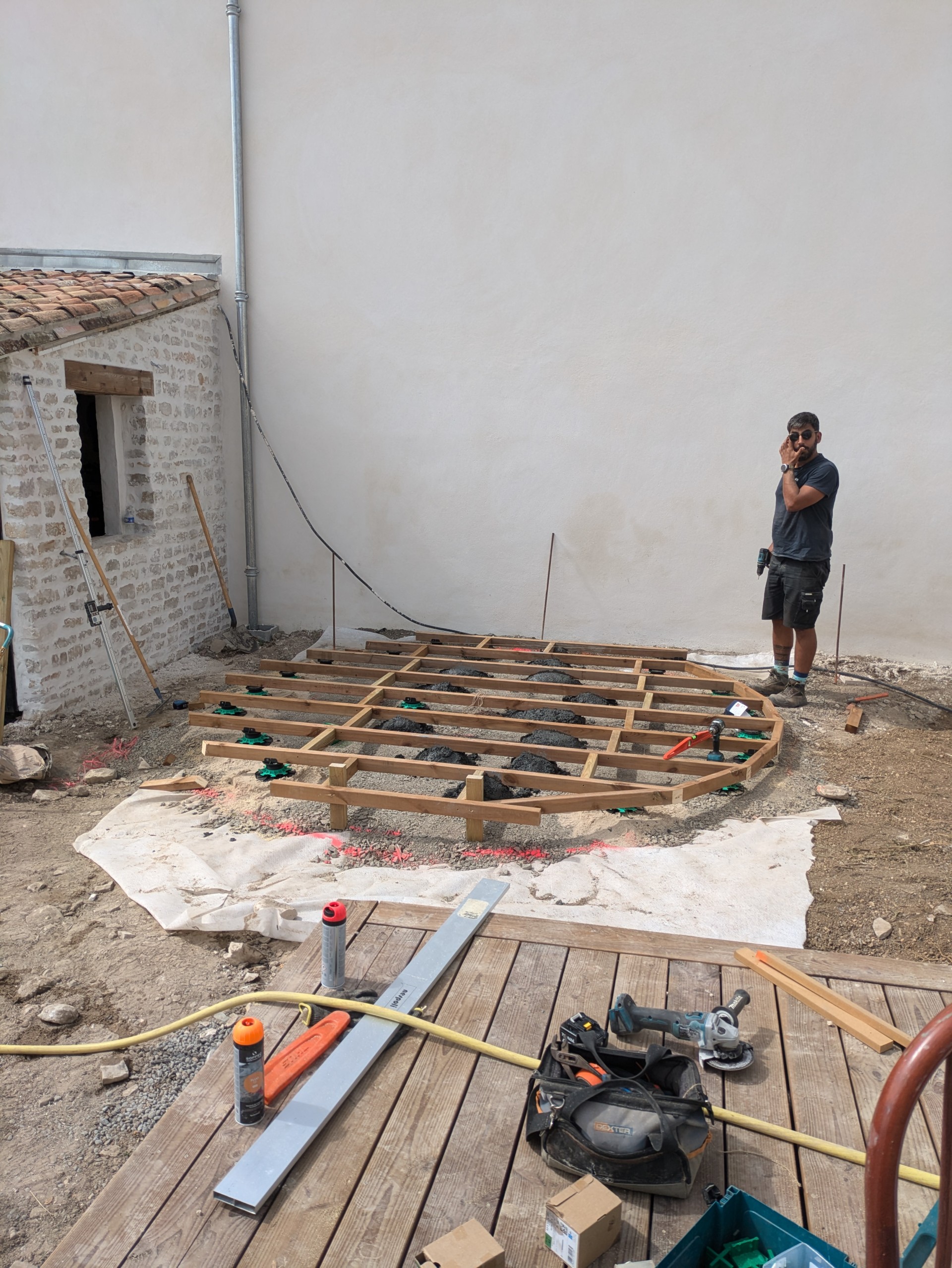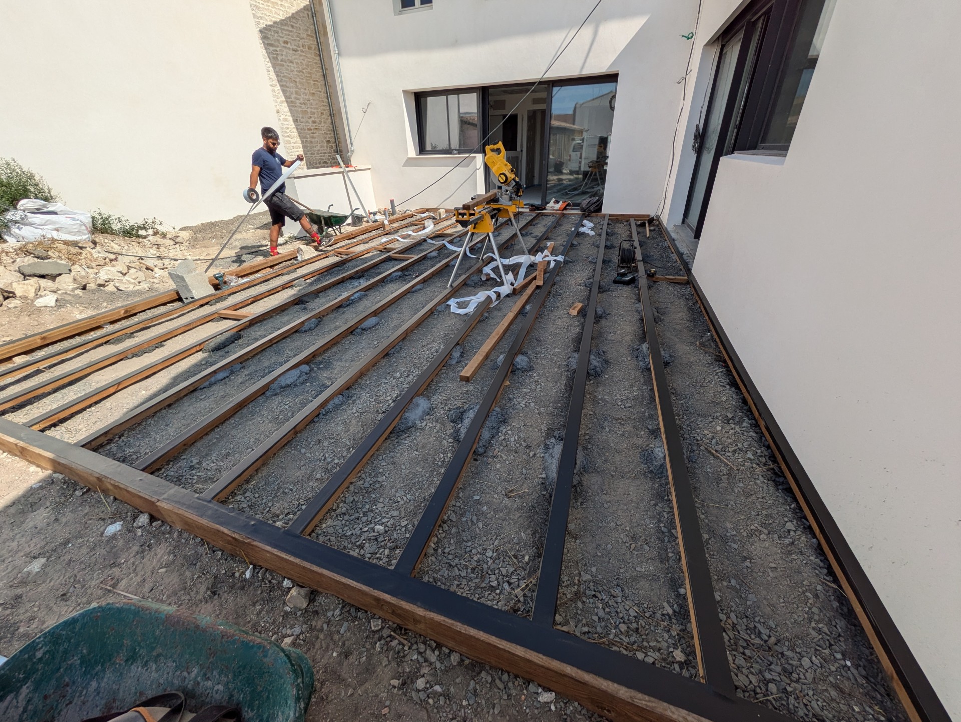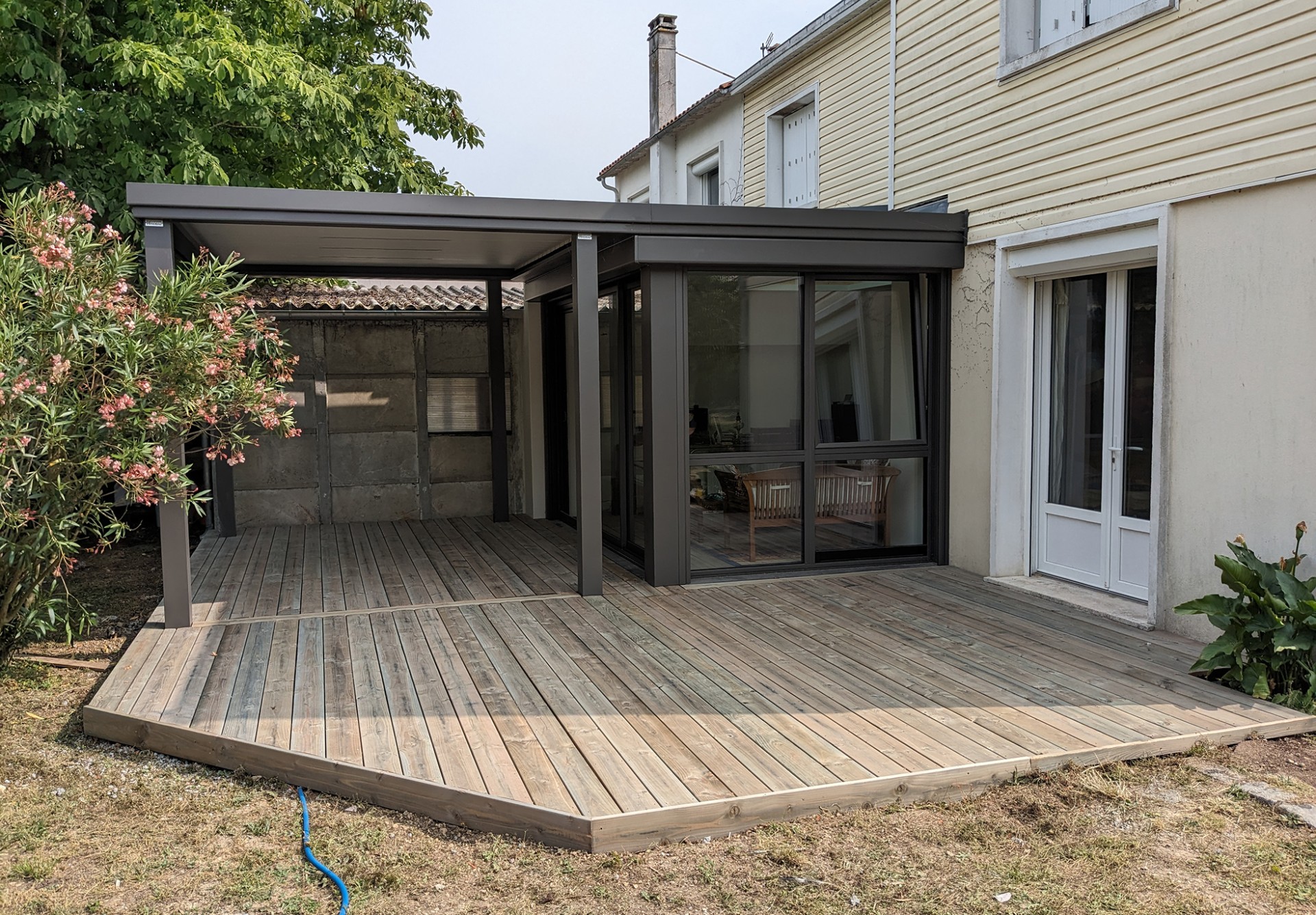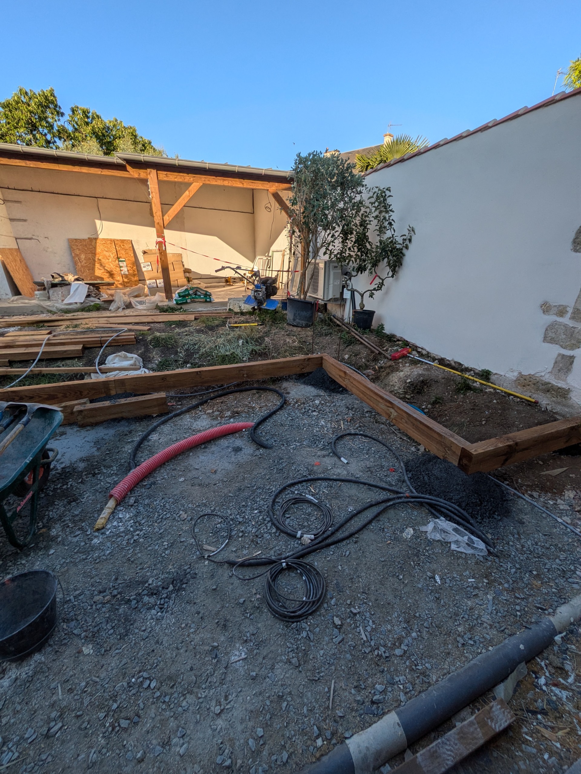 Ce petit jardin nécessitais le plus grand soin. Soutènement en traverses paysagère, terrasse en bois et gazon de placage avec système d’arrosage automatique etbardage bois sous l’appentis.