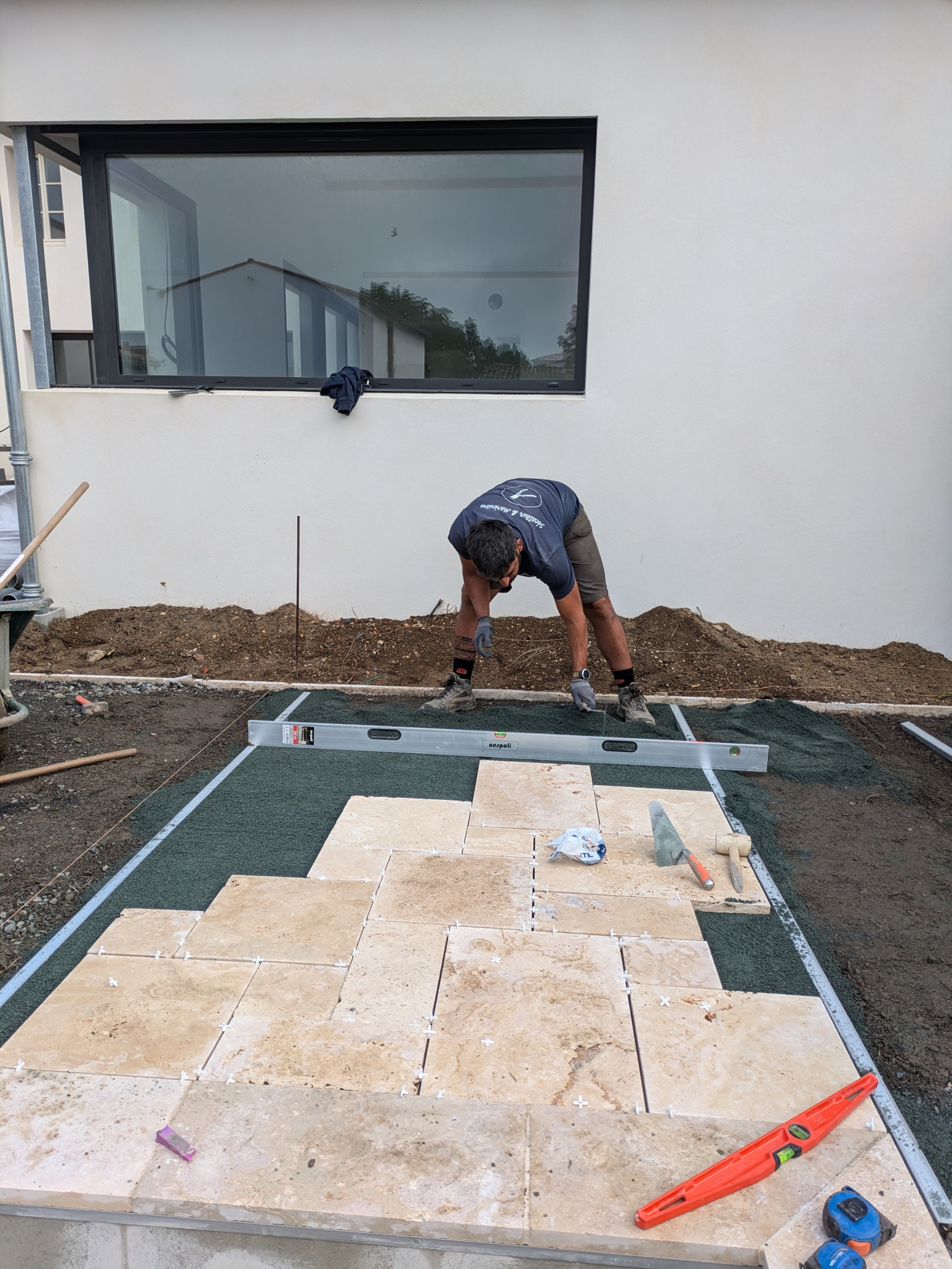 Pour le compte d’un promoteur, conception et réalisation d’une modélisation 3D du jardin destiné aux plaquettes commerciales. Réalisation partielle des travaux, terrasses en travertin, terrasses en bois, pas japonais, apport de terre, engazonnement et réseau d’arrosage automatique
